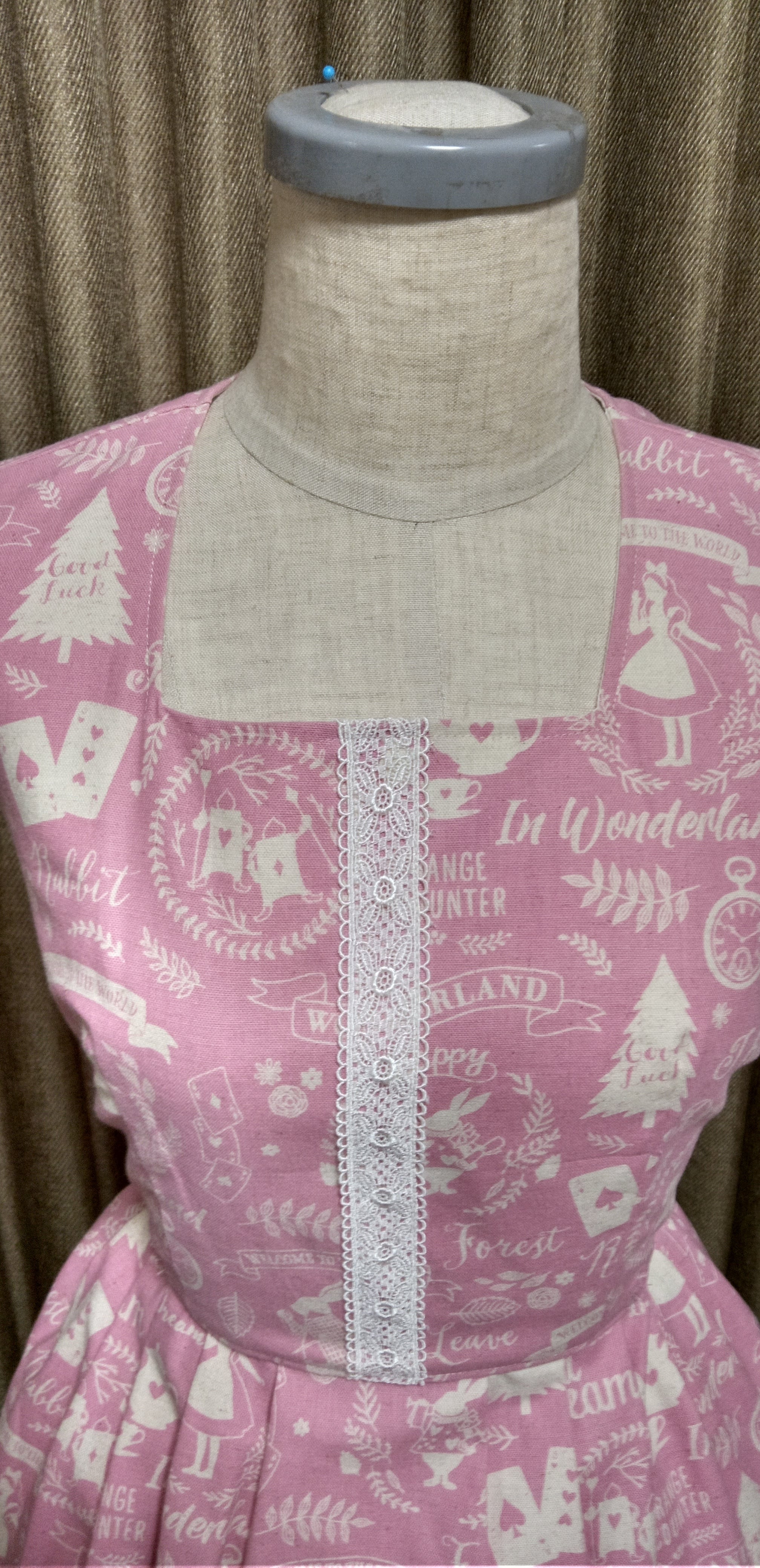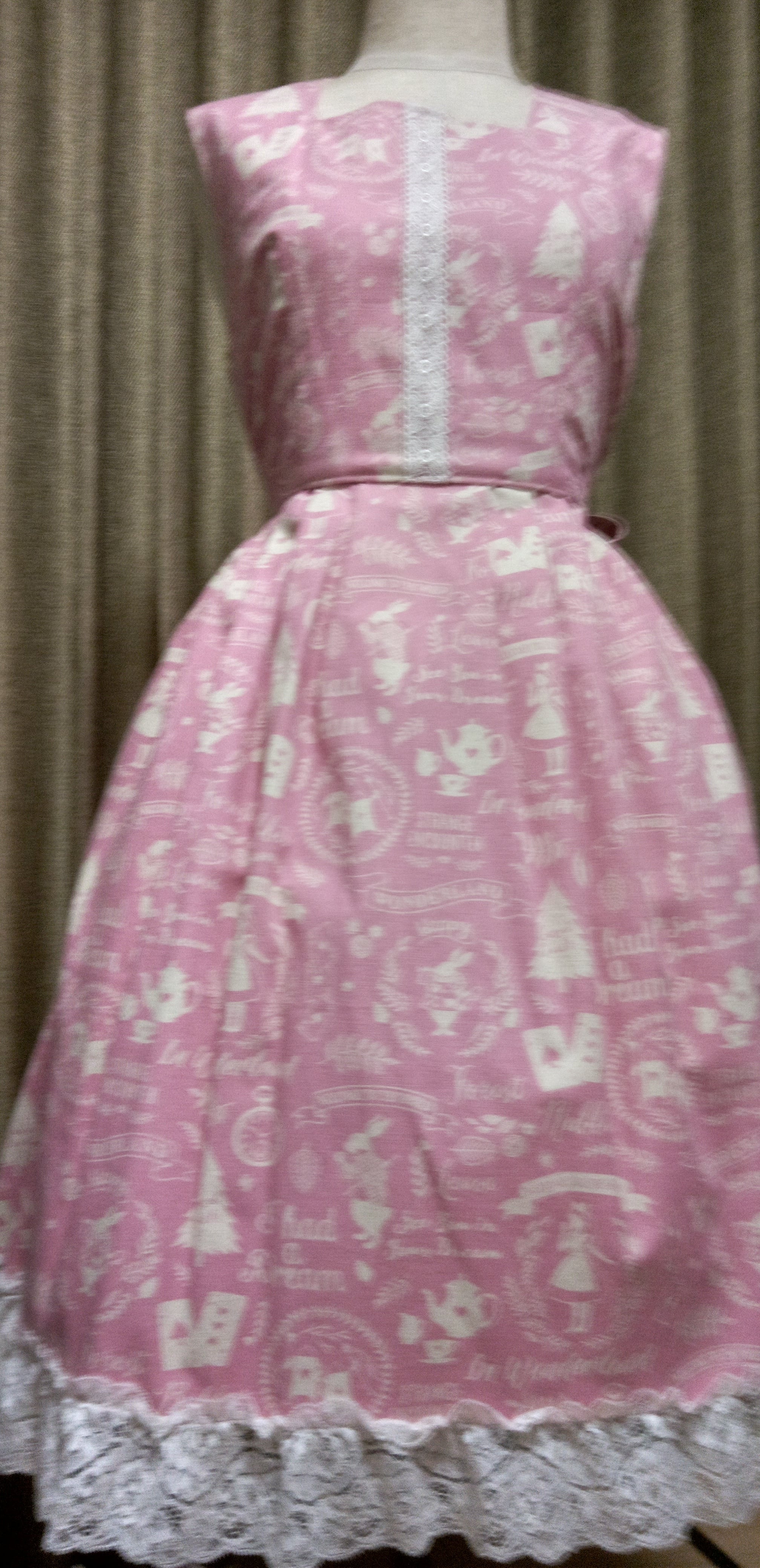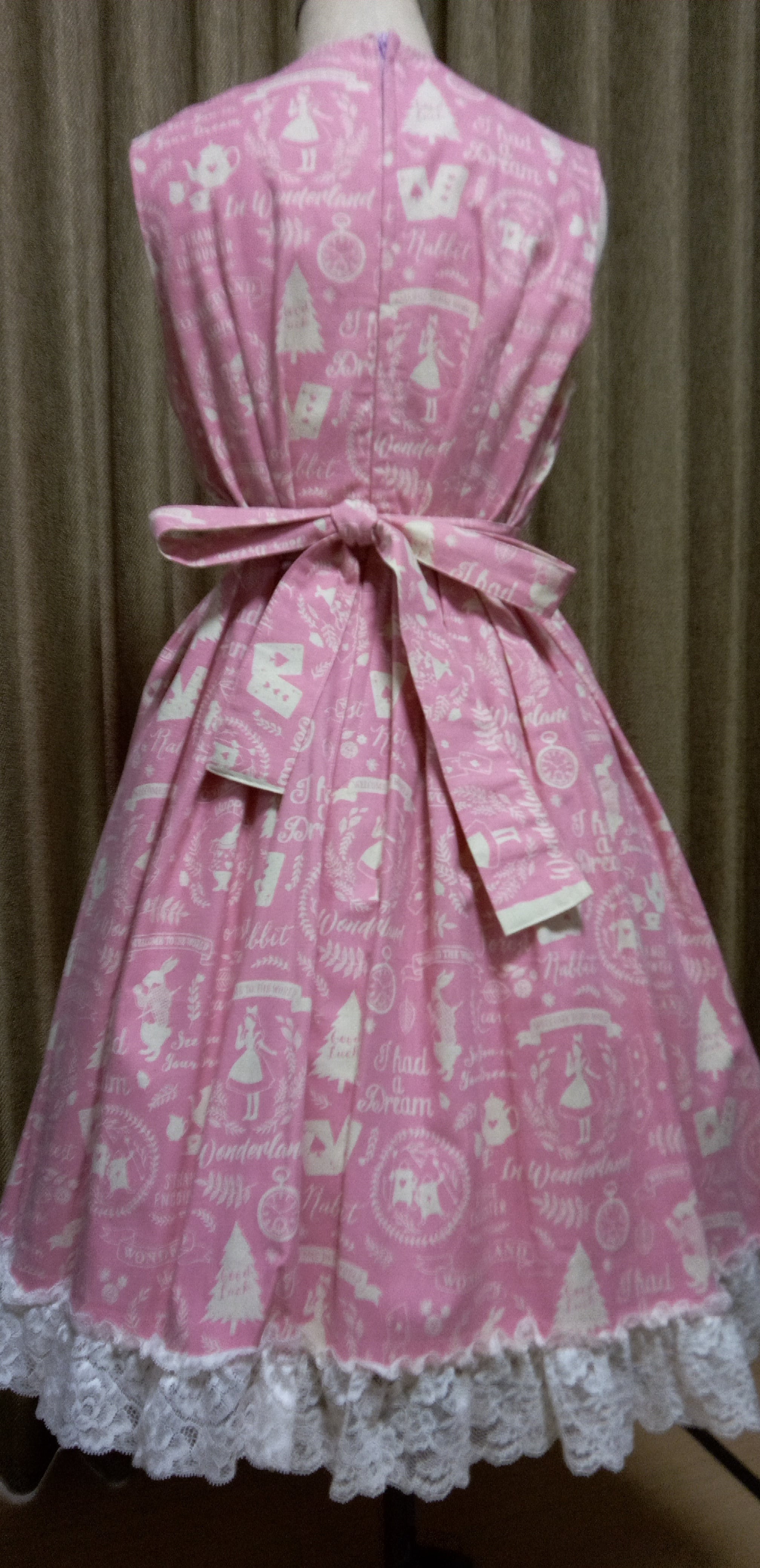 アリス柄の麻混ピンク生地のジャンパースカート